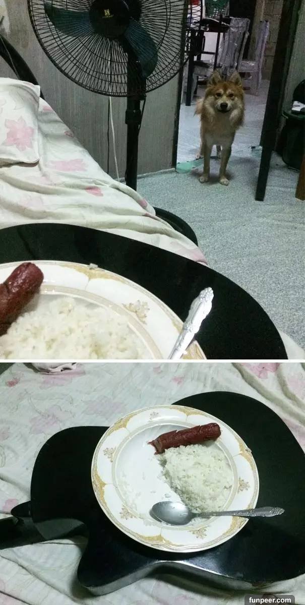 狗狗害怕吉他,於是主人在吉他上吃飯,再也不會被搶食物了,嘿嘿