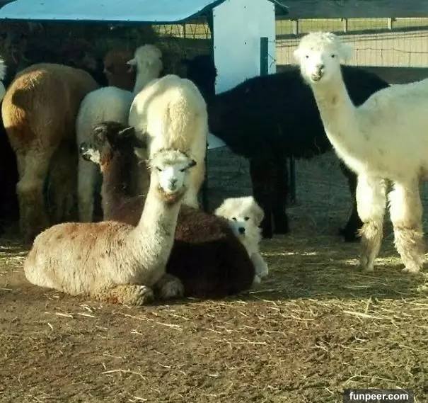 因為怕割草機,躲進了羊駝群