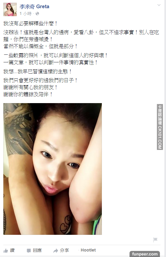 「世姦情」F奶李米奇臉書po全裸合照反擊:怪台灣人太八卦!