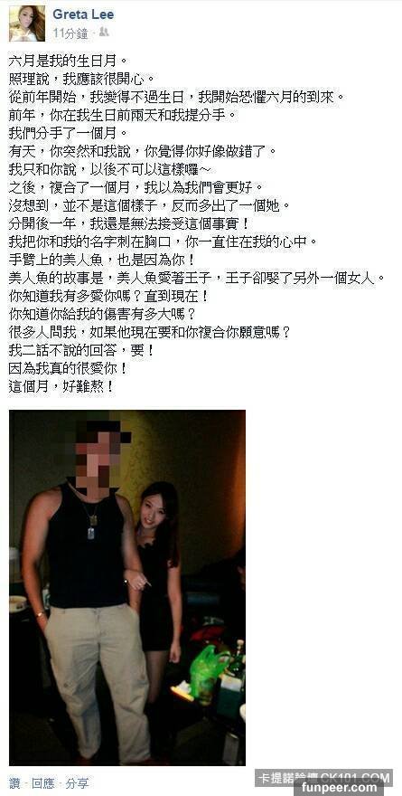 ▼F奶李米奇臉書動態自曝還愛著前男友潘X中,胸口的刺青是為了前男友而刺的...