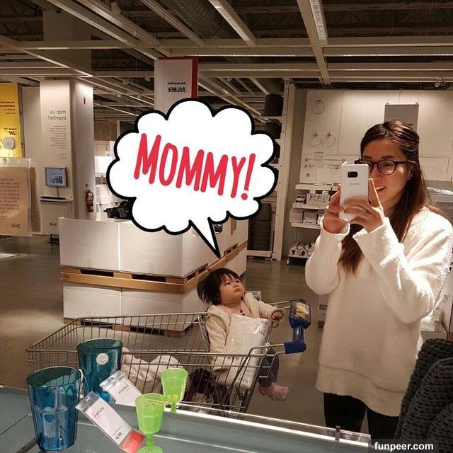 鍾嘉欣推著購物車和Kelly對鏡自拍。雖然鍾嘉欣打扮很隨意,素顏戴著眼鏡也依然漂亮。