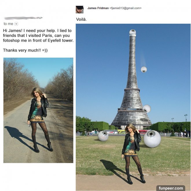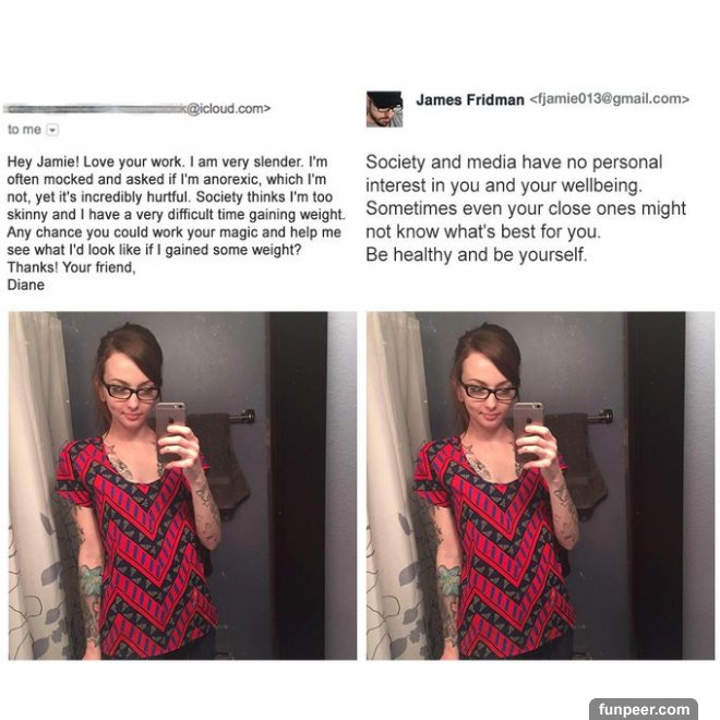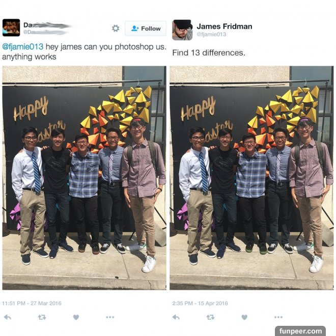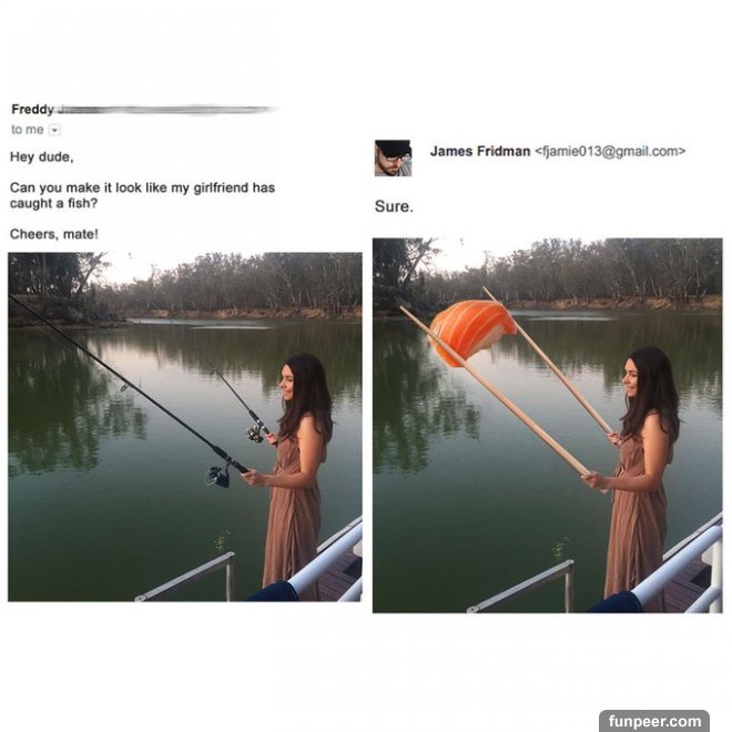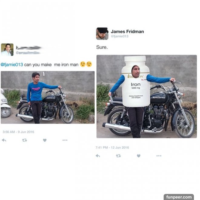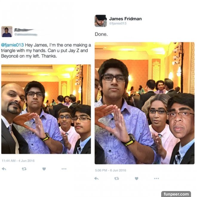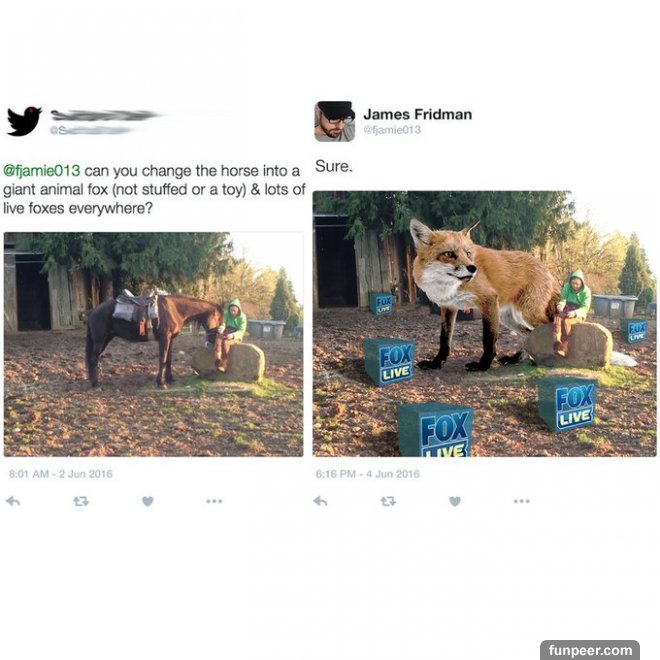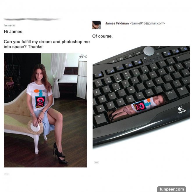 這位創意大於修圖技術的PS神人James Fridman算是小有名氣了,她在網路上接受網友們的各種投稿需求,但他都會用自己的方式幫它們實現願望..