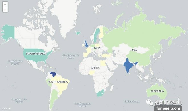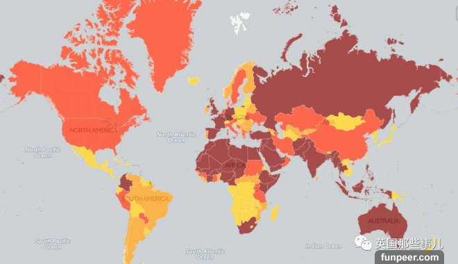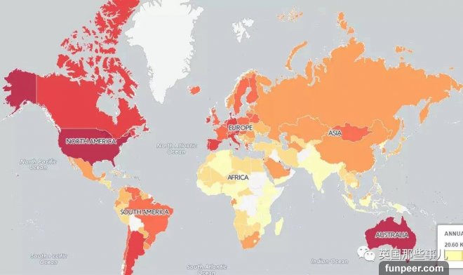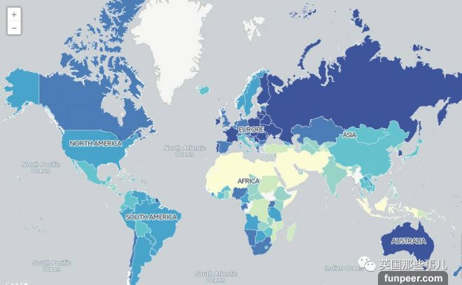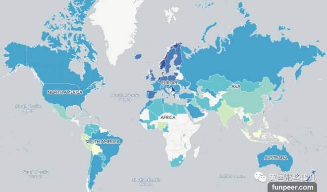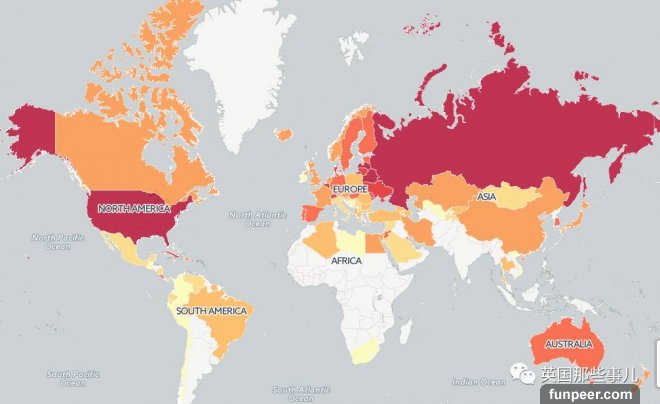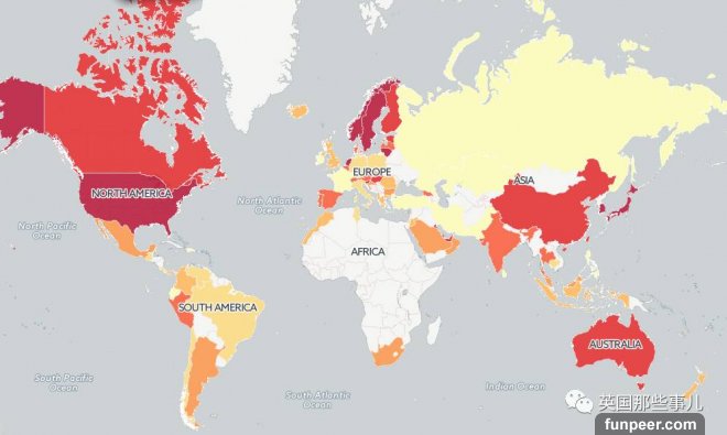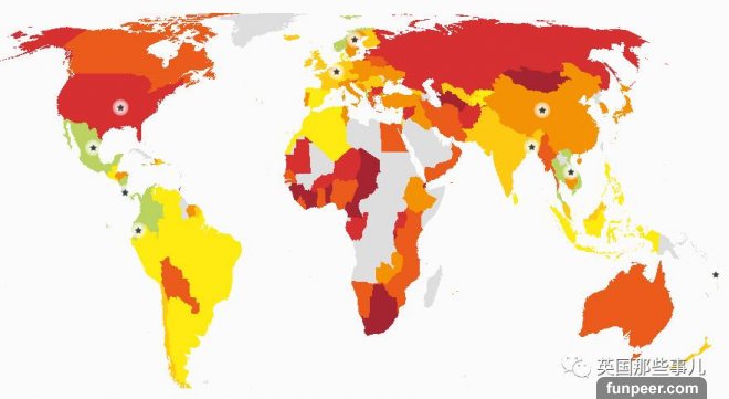 根據報道,全球最胖的國家…竟然不是美國,而是一個沒有存在感的小國,薩摩亞群島。在這個島國上,74.6%的人屬於肥胖範疇。之後的排名又是一溜串不知名的太平洋島國,佔據了前十,科威特是其中唯一一個例外,它在中東。在南太平洋,成年人的體重增長要比全球的增長快4倍,這可能是由於那裡的居民們選擇了西方的快餐作為了主食。在大國中,美國在肥胖榜上排18位,全國有33%的人被認定為肥胖,英國是43位,有36.9%被認為是肥胖。肥胖症在東亞不是一個問題,在中國只有5.7%的人是肥的,日本是5%,韓國是7.7%。9,哪國的幸福指數最高?(顏色越深,說明越不幸福)