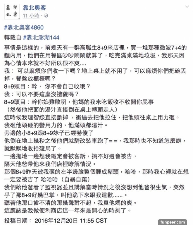 網友在靠北奧客PO文,前幾天有一群高職屁孩到便利商店來消費,不只吵鬧還弄得滿桌滿地都是垃圾,當天心情本來就很差所以更不爽了。他問屁孩:可以麻煩你們收一下嗎?地上桌上就不用了,可以麻煩你們把碗丟掉,餐盤放櫃檯嗎?屁孩領袖答:幹, 你不會自己收哦?最後屁孩把麵的湯汁直接倒在桌上轉頭走人,當下網友理智斷線,衝過去把他頭往桌上用力砸,害得他滿頭湯汁。 旁邊的屁孩們當場嚇傻,沒多久就騎着改裝車跑掉了。想不到隔天屁孩爸爸來店裡瞭解情況,屁孩左半邊臉腫成豬頭,當下心想要被告了...想不到屁孩爸爸看了監視器並且瞭解當時情況後,很生氣並打了屁孩好幾巴掌,還要他跪下來道歉,當下是他做了一年來最開心的時刻。