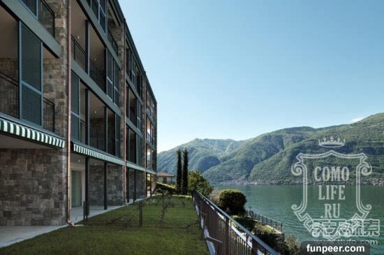 義大利萊澤諾科莫湖畔一室公寓,湖泊邊景觀房、室內裝飾是天然石材和木材。