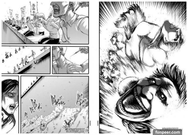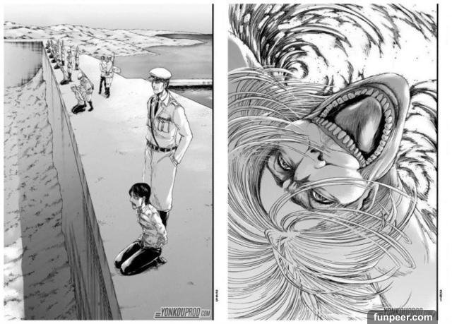 ▲兵長獵殺巨人在第87話中,出現一個宛如槍決現場的畫面,左側那個跪著的胡子人就是艾倫的爸爸,右側則是吃了艾倫媽媽的巨人。