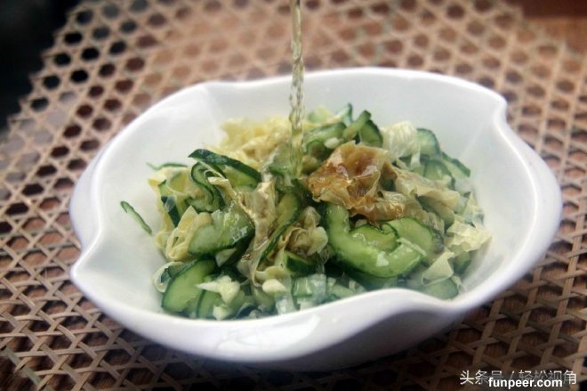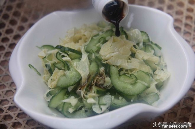 7.豆腐皮和黃瓜拌勻後,加入食鹽、生抽、醋調味。![]()