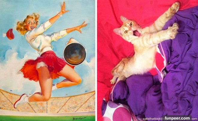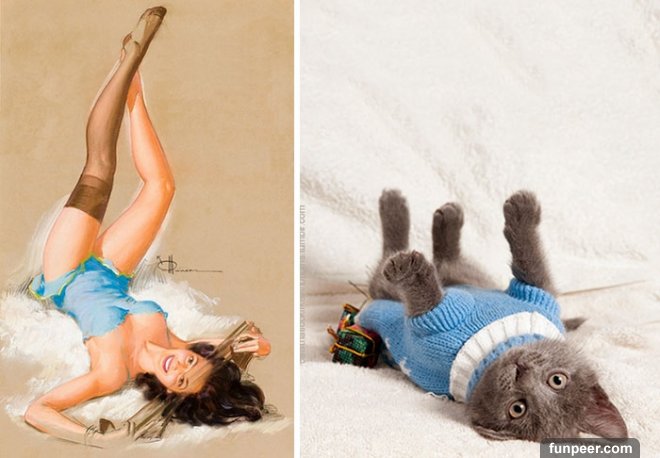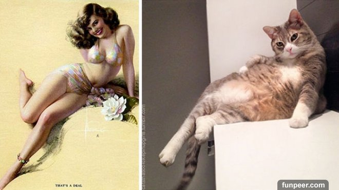 ▲臀部絕對是性感的要件阿!(source:catsthatlooklikepinupgirls下同)你愛看美女嗎?婀娜多姿的身材、帶電又不親和的眼神、遙遠的距離感,這些東西加起來讓你心臟又漏了一拍嗎?其實上訴的這些特質在貓咪身上也都看得到,而且甚至可以懷疑現金拍照的性感姿勢搞不好都是參考這些可愛貓來的呢!讓我們來看看15張「辣貓」而這些性感美女的對比吧~1.