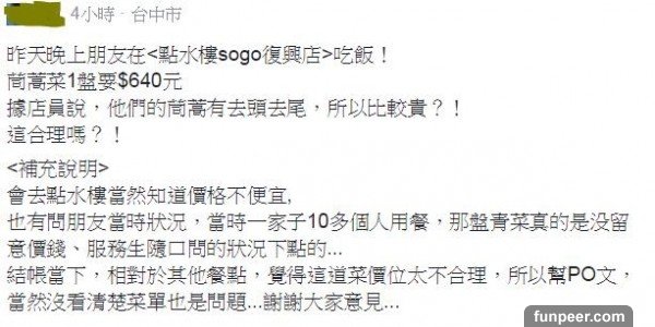 一盤茼蒿竟要價640元,讓她氣得跳腳直呼這根本是黑店!還氣到PO文叫網友評評理,並在貼文中反問「據店員說,他們的茼蒿有去頭去尾,所以比較貴?!這合理嗎?!」![]()