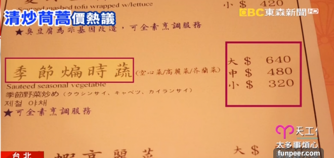 影片來源:東森新聞唉.....店家都標示那麼清楚了,點了再來喊貴到底是什麼概念.....不過小編是比較好奇,為什麼要去貴貴的餐廳吃「媽媽煮的還比較好吃」的炒青菜呢??(一頭霧水)