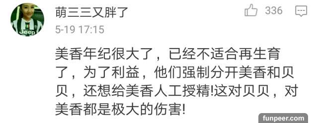 @熊貓貝貝後援 列出一組數據,稱美香儼然被當成了生仔機器。美香是1998出生,2000年被送往美國。在過去的17年間,史密森尼國家動物園一直對美香進行繁殖計劃。除去自然交配,美香接受人工授精18次,產崽4次共6隻,僅存活3隻。美香現在19歲(相當於人類60歲),但華盛頓動物園還要她繼續生。官網最新消息稱,美香在今年的發情期中自然交配失敗,已接受人工授精。