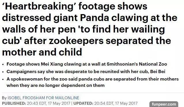 隨後,有網友發布視頻,爆料稱:貝貝被單獨隔離開來,周圍沒有母親,沒有同伴,也沒有飼養員照顧......非常可憐,一直瘋狂地在找媽媽。而美香也急切地想尋找它的寶寶,不停痛苦地撓牆......甚至能聽到美香的哭泣和呼喊聲。 英國《每日郵報》5月17日發表題為《令人心碎的視頻:大熊貓爬牆沮喪地尋找自己被動物園隔離開的幼崽》的報道,稱: 美香和貝貝被強行母子分離導致抑鬱 。