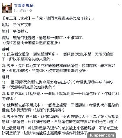 圖翻攝自臉書文青別鬼扯 聽到有人誠心發問,許多知情網友紛紛來解答了,很詳細的解釋了夜市麵包低成本的原因。網友說,這些麵包都是麵包工廠做的,攤商只是去批來賣,賣不完還可以回收給工廠,而且這些平價麵包都是機器做的,人力成本低,而且只要加幾滴香精就可以做幾十公斤的麵包。