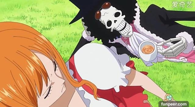 而在娜美与加洛特聊天的时候,布鲁克迅速插入,躺在地上看看风景