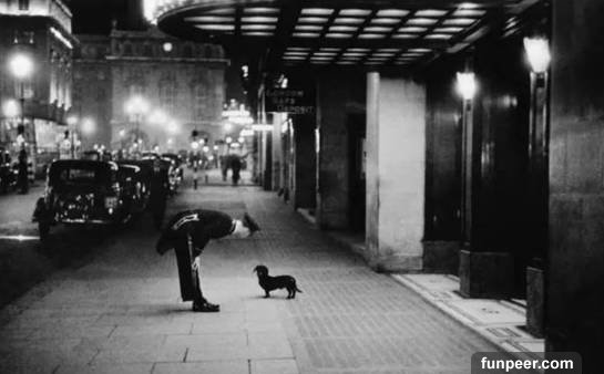 1938年,在英國倫敦 Piccadilly廣場外,一家賓館的禮儀官在跟一隻臘腸犬打招呼。
