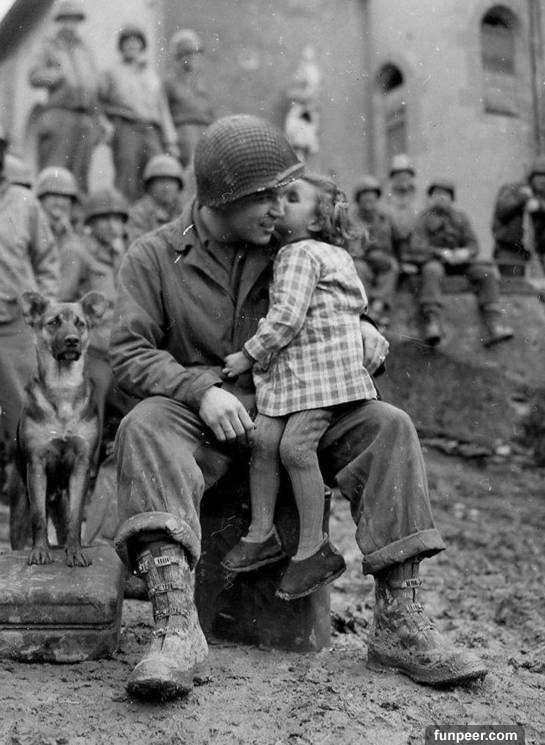 1945年的情人節,美國士兵在狗狗的陪伴下,接受一個法國小女孩送來的甜蜜的吻。