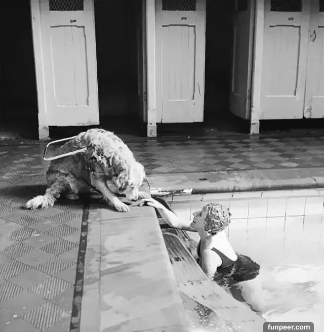 1966年,盲人姑娘在泳池邊休息,她的導盲犬在一旁守護。