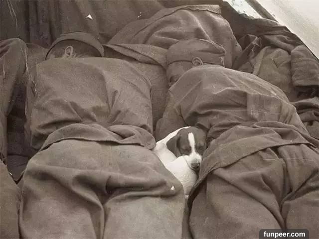 二戰期間,一隻流浪狗,和俄羅斯士兵窩在一起沉沉睡去。