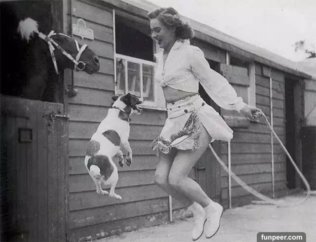 1940年,跳繩的少女正帶着狗狗一起玩耍。