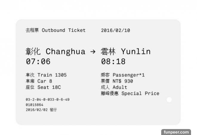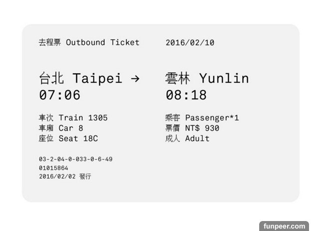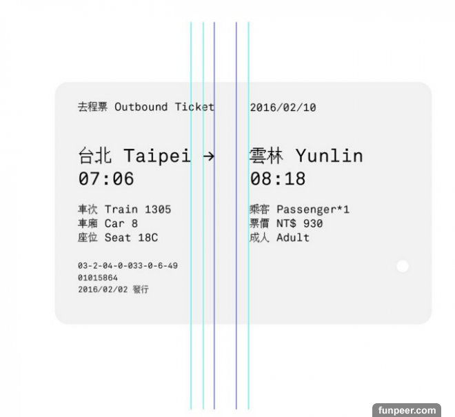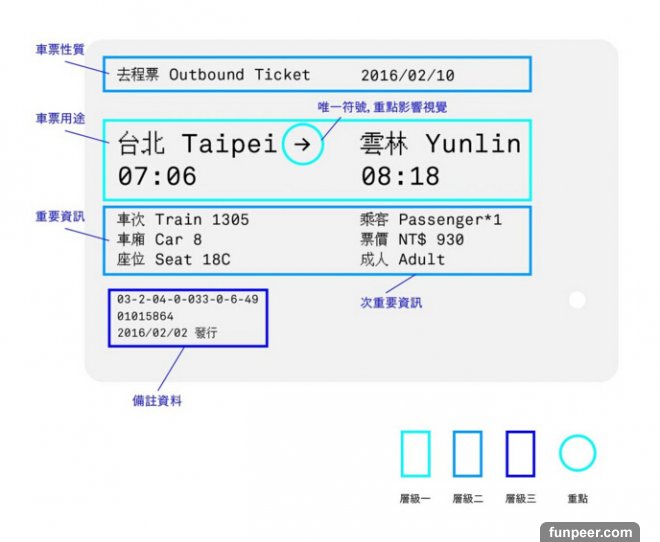 一)先把要印在車票上的資訊分組。我分組的方法是:哪些資訊乘客會先看,或是哪些對乘客最重要,會以大小分類,再賦予適當的行距。我自己的體驗是,票出來必定先看出發地和目的地的名字,然後對一下時間(也是原有設計的考慮),這資訊不會看一次不看的,因為這組資訊也會帶給我安全感,明確給我知道我沒有買錯票。所以放最大和黃金位置,屬於第一層次。第二層次總共有三組,第一組是放大票頂的點題資訊,包括這是出發用票、出發時間(原設計有些資訊有些沒有,這裡必須要補回來);第二組是看完車票作用後會用來找車廂、坐位等重要資訊,會放在第一層次的左下方,既順暢也最方便找(假設大部分人用右手拿票);然後是次要一點的收費資訊,給客人拿發票、存根用;最後是註腳資訊,必須的時候才看。分好了之後比原設計還少了一組,現在清晰多了。