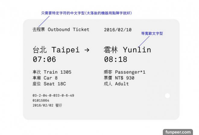 三)選字體。考慮到機器的印刷部件暫存記憶可能很小,第一是中文字可以考慮用點陣、然後 subset 需要的中文黑體字就好(這裡 Demo 的是明體),建議用黑體是因為資訊繁多,正體字的外觀也比較密麻,讓乘客乘車時保留冷靜情緒很重要,而且歐文等寬字也大部分是無襯線體,這裡用黑體有利中歐文搭配。其後是歐文字,等寬(Monospaced)又容量少的歐文字體實在很多,不難挑一個好的,最重要是挑風格冷靜、x-height大又清楚的設計。