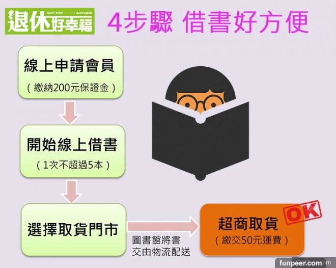 想要使用這項服務,其實很簡單: 第1步-線上申請會員:想要變成網絡會員,首先,必須先有臺北市立圖書館的借閱證,若是尚未申辦,可先行至臺北市立圖書館辦理;成為網絡會員後,需繳納200元的保證金,民眾可利用劃撥或直接至館內繳費。(如配送至超商後未取書,將從保證金中扣款) 第2步-網絡預約:進入臺北市立圖書館官網,選擇「A01超商借書」服務,開始選書。超商借書一次不得超過5本,如另有在館內借書,總數不可超過10本。 第3步-選擇取書門市:在網絡上選擇取書的便利商店。 第4步-前往門市取貨:憑短訊或E-mail通知,直接到個人指定超商取貨,並支付運費50元,如需寄回運費每次50元。如果是在圖書館借書,想要透過超商還書者,也可至全家超商辦理,每次運費45元。