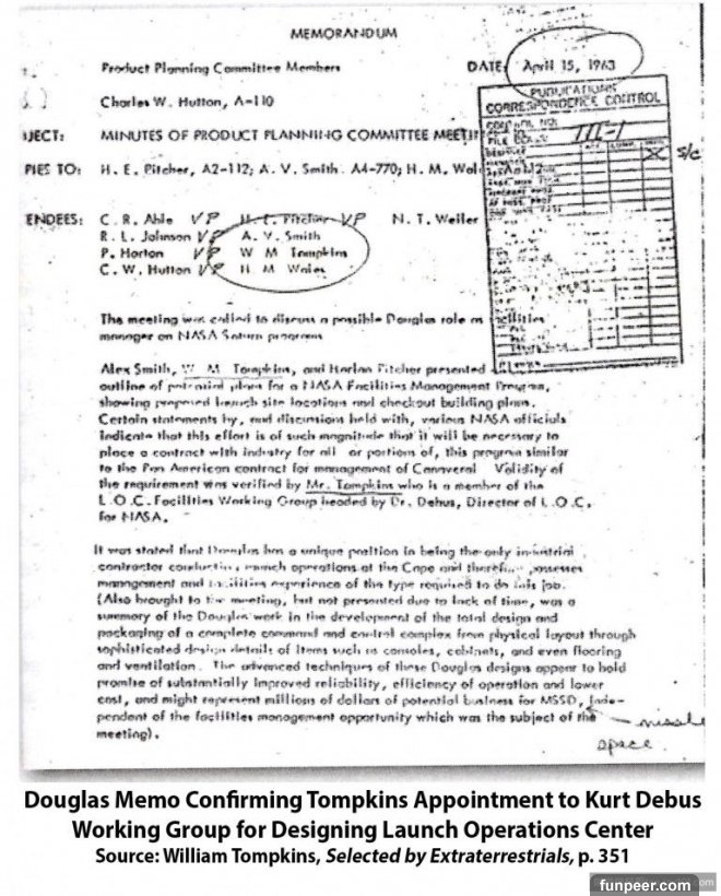第二份文件是道格拉斯飛行器公司在1963年4月15日簽署的備忘錄。 備忘錄的內容是確認德布斯博士調派湯普金斯到發射任務中心以及他在公司為NASA進行的設計工作。