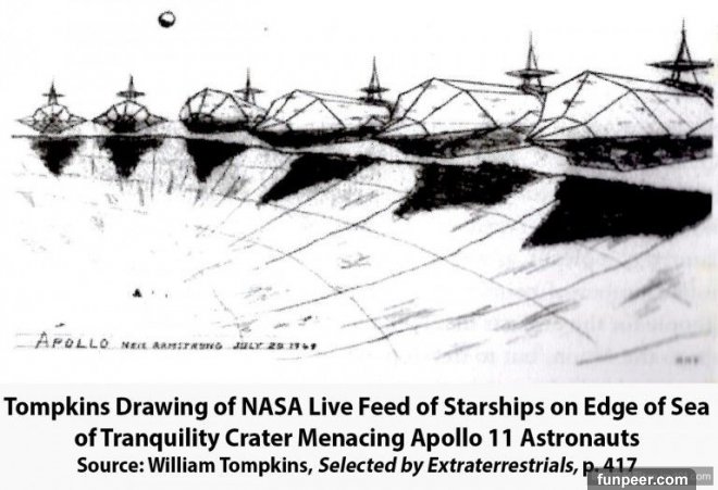 阿波羅登月艙降落在寧靜海隕石坑,而巨型太空船就停靠在隕石坑的邊緣。尼爾‧阿姆斯壯踏出人類在月球上的第一步之後,他抬頭觀察隕石坑的邊緣;隨即連絡任務指揮中心: 『這裡有其他的太空船。它們的體積非常龐大』。當年社會大眾沒聽到阿姆斯壯的說詞,也沒看到外星巨型星艦的直播畫面。阿姆斯壯用攝影機360度錄下隕石坑週遭的景象,後來美國中情局用遠超出絕對機密的規格封鎖他拍攝的畫面。 (Selected by Extraterrestrials, 第418頁)