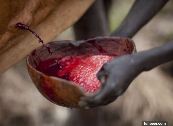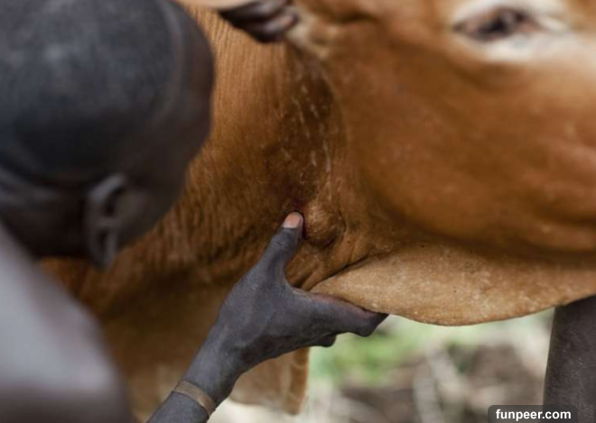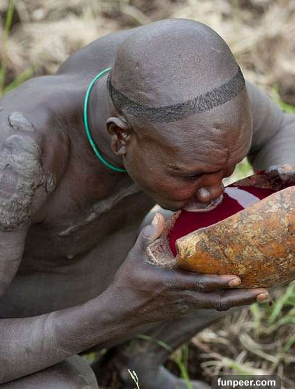 他們會先用鋒利的箭刺穿牛的動脈,並一口氣喝掉新鮮大量的牛血!