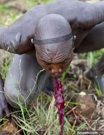 鬥棍比賽開始之前,所有參賽的勇士們都需要先經過血餐儀式,一口氣生飲2升的牛血!