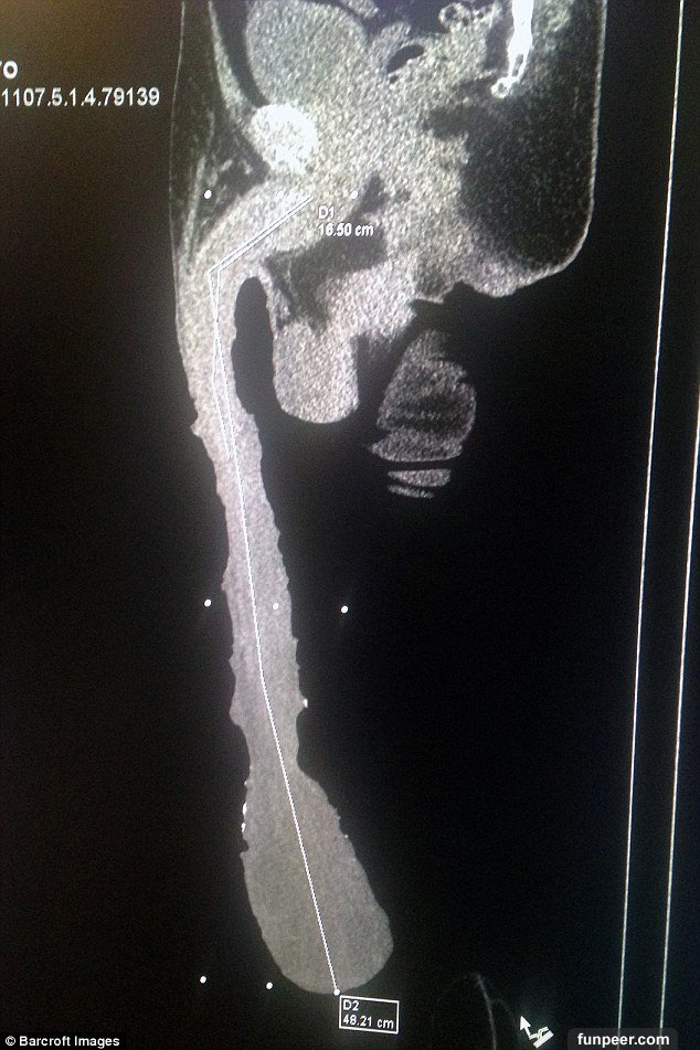 不過醫生看完X光片表示,其實他那支長達48cm的大GG,其實有很大一部分都是包皮,其真實的長度可能只有7英吋(18cm),而且最後來建議他如過未來有想要愛愛或是生小孩的打算,就一定要做「縮小手術」,否則一輩子都要保持處子之身....