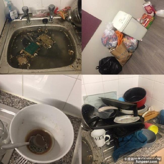 儘管從她曬出的照片來看,成堆吃完食物的包裝盒、溢出的垃圾桶、廚房還殘留著燒焦的食物、沒洗過的碗、滿是油的桌面…看起來相當恐怖。Cooper和她的室友,總是能打扮得漂漂亮亮出門,讓人完全想像不到她們生活環境是如此恐怖。