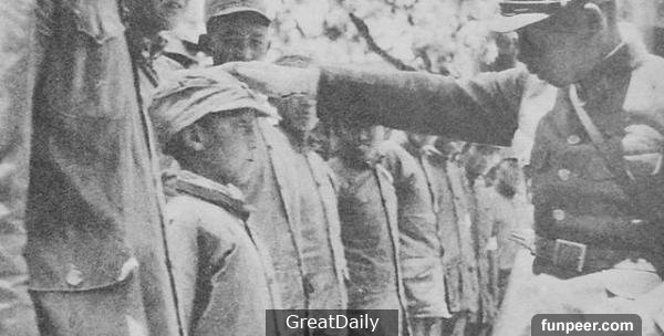 全民抗戰期間,不分男女老幼,紛紛上陣殺敵。圖為1939年,山西柳林,年僅10歲的國軍上等兵被俘,面對日軍隊長挺起胸膛。