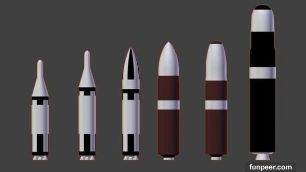 圖中最右側的分別是三叉戟IC4和三叉戟IID5。三叉戟IID5飛彈的重量增加到59噸,直徑增加到2.11米,長度增加到13.6米。重量和體積的增加,也伴隨著射程增加,三叉戟IID5飛彈的射程可以達到1.2萬千米,而攜帶彈頭的數量則增加到14個。