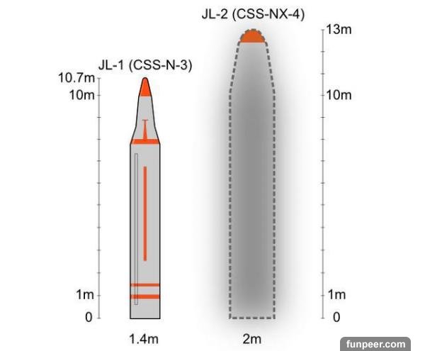 巨浪-1型飛彈和巨浪-2型飛彈的尺寸對比。巨浪-2型飛彈是在2015年才開始同094型核潛艇一起進行戰略威懾巡邏的。