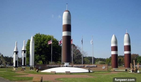 美國大西洋戰略武器設施,最右側豎立的就是三叉戟IC4型飛彈。注意三叉戟IC4和三叉戟IID5飛彈的差別,D5的彈頭整流罩部分要圓潤一些,而C4的要相對尖銳一些,再則就是對比個頭大小。