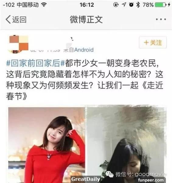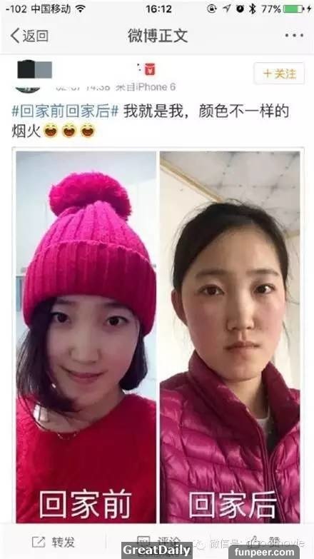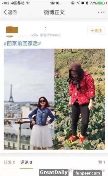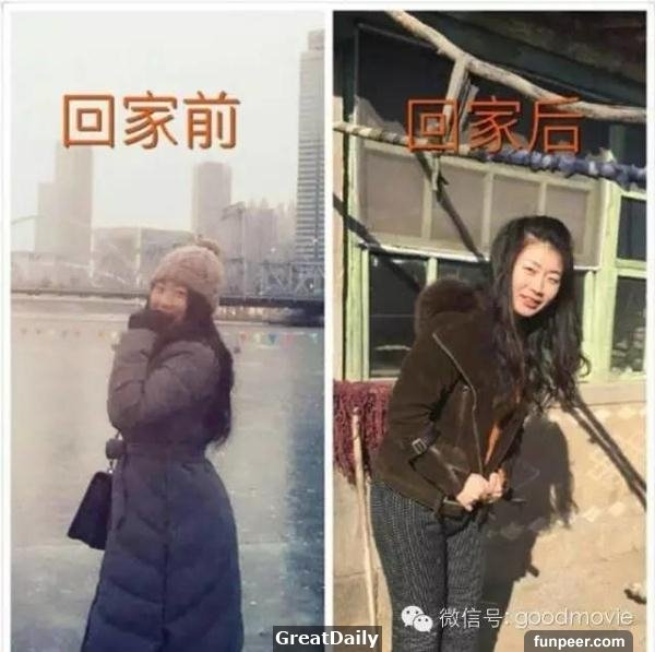 春節期間,網絡上興起了一個「春節回家之前之後照」的風潮。很多網友紛紛開始上傳自己在平時生活的模樣,和回到鄉下老家後的超大轉變。在都市裡生活的照片看起來都很時尚,但一看到他們回家後的照片……整個世界都有種酸酸的感覺,快來看看!1. 在都市超時尚,穿搭都很有巧思,但一回到鄉下,感覺她下一刻就要去耕田了…