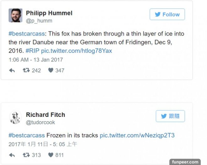 ▲「冰凍狐狸」在各地爆紅。(圖/Johannes Stehle)國際中心/綜合報導德國西南方的弗里丁根(Fridingen)多瑙河上驚見「冰凍狐狸」!獵人史戴勒(Franz Stehle)於去年12月發現,之後用鋸子將整隻狐狸切下來,冰凍中的牠毛髮看起來栩栩如生,好像還活著一樣,目前被放在家族飯店中,在那裡向大眾展示。綜合外媒報導,這隻狐狸疑似在多瑙河快結凍前,踩在薄冰上移動,然後掉進河中溺水,之後就被凍在裡面了,史戴勒表示,這隻狐狸不是第一隻被冰凍的,先前也曾看過冬天被冰在湖中的鹿或熊,但都無能為力。他將整隻狐狸用鋸子切下來後,本來打算將屍體丟掉,後來決定將牠帶回酒店,當成多瑙河的警告,提醒世人不要輕忽大自然的力量,並且上傳照片。沒想到照片紅遍全世界,許多人在推特上用標籤#BestCarcass長久紀念這些不幸死亡的動物。