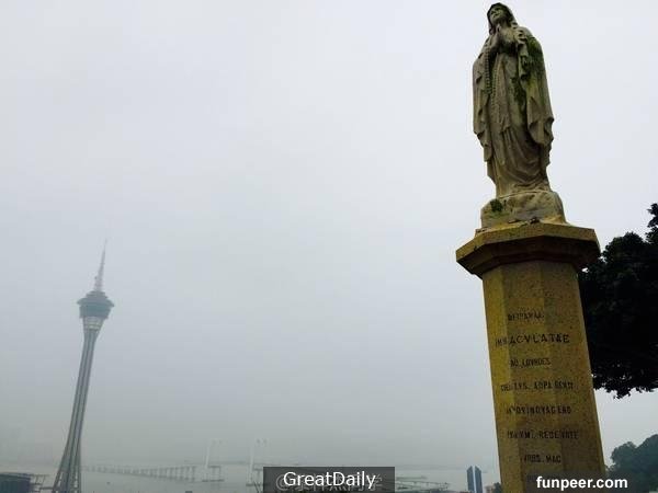 Macao」,更發展到後來粵語音譯的「馬交」。媽閣廟供奉媽祖,從明朝建廟至今已有五百餘年,乃澳門現存曆史最悠久的古建築。此處既是往昔沿海人民尋求平安、庇佑的信仰寄託之地,也是澳門接觸外面世界的最早的窗口。旁邊有澳門海事博物館,而眺望到大陸的對岸則是珠海市香洲區的灣仔,上一次去的時候看到那邊在不停地建高樓。