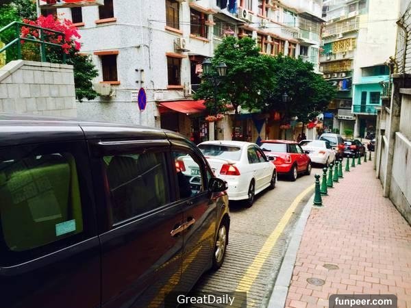 而在斜巷邊上亦有因「萬裏長城」而得名的公寓「長城大廈」。如同澳門眾多道路一樣,媽閣斜巷比較狹窄,是單行道,一旦遇上等紅燈,就會出現下圖中車從山腳排到半山腰一動不動、連「萬裏長城」都塞車的景象。