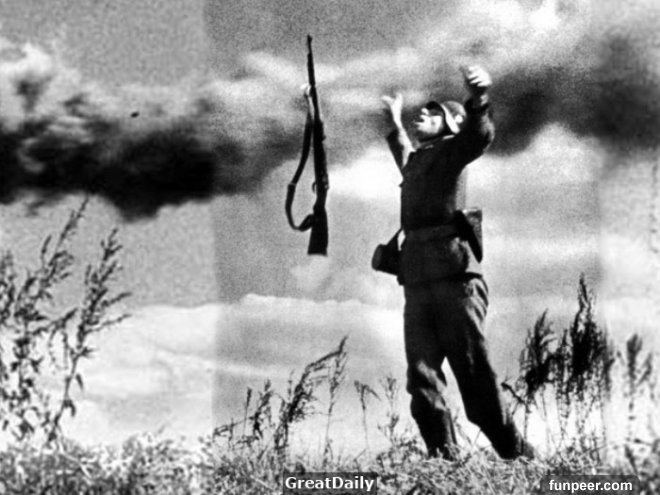 第一位在戰爭中死去的德國軍人是由日本人所殺。圖中是一位德國士兵中彈身亡瞬間,他手中的毛瑟98K步槍掉到地上。