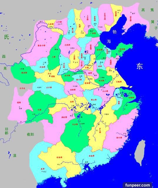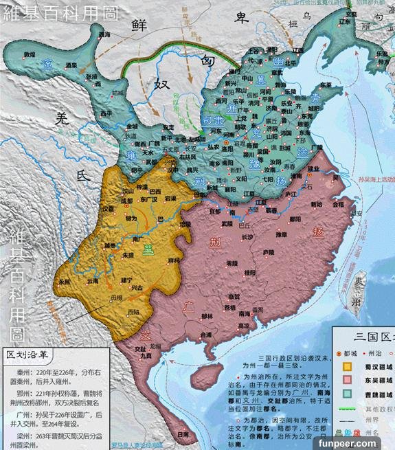圖4 三國。東漢末年,中國開始陷入分裂的局面,一直持續到隋朝統一。但是,即使這樣,中國的國力依然比印度強太多。