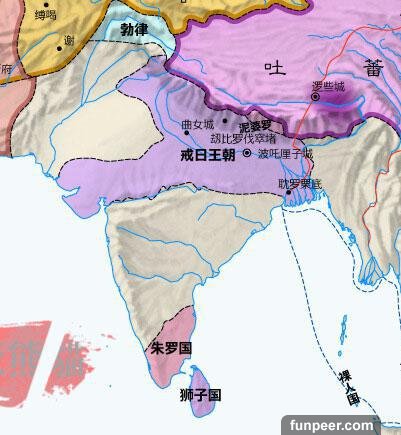 圖5.1 戒日帝國。在經歷幾百年的分裂之後,印度終於在戒日帝國的統治下完成了北部的統一。可惜,戒日王死後,戒日帝國馬上開始衰落。最後,居然被大唐帝國的普通使節王玄策輕易滅掉.