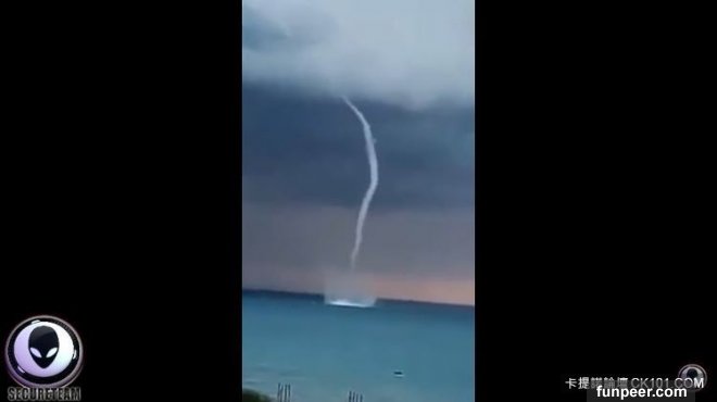 只見,有民眾拍下UFO在半空雲層出現,不久海面便出現一條長長的水龍捲,疑似UFO在吸走海水▼