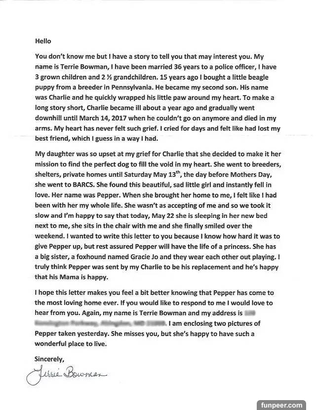 經過幾天的相處,Pepper現在已經充分融入了新家庭,並且和Terrie成為了最好的朋友,就在幾天前,Terrie決定給Pepper的前主人,寫一封信: 「你好, 你可能不認識我,但是我有一個你可能會感興趣的故事。我的名字叫Terrie ,我和一個警官結婚36年,生了3個孩子,還有兩個半孫子。 15年前,我在賓夕法尼亞州買了一隻比格犬,它成了我的第二個兒子,它叫Charlie,它很快占據了我的心,長話短說,它在今年3月14日的時候去世了,我悲痛萬分,整日以淚洗面,我覺得我失去了我最好的朋友。 我的女兒很擔心我的狀況,於是她決定再找一隻狗狗來填補我的悲傷。找了很久,終於在5月13號,母親節的前一天找到了這只可愛的比格犬。它就是Pepper... 當它第一次來到我家的時候,我感覺我好像以及認識它很久了。一開始的時候它還不是很適應,於是我慢慢來,就在今天,5月22號,它已經可以睡在我的床上了,它和我坐在同一個椅子上看電視,看到我們的時候會微笑着搖尾巴。 我想要寫信告訴你的是,我能理解你不得不把它送走的心情,單絲我保證,Pepper的餘生都會過得像個公主一樣愉快。