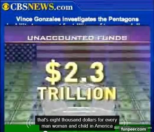 第一: 2001 年 9 月 10 日,當時的美國國防部長倫斯斐在記者會上,說五角大廈“無法追蹤”約 $2.3 trillion 二點三兆美元的錢,也就是不知道花到哪裡去了。這在當時是一筆天文數目,現今的美國總國債也才 16 兆元,而國防部不知道把這麼大一筆納稅人的錢花到哪去了,竟然完全沒有人過問,因為第二天就發生了 911 事件。911 當天“恐怖分子駕機”(說是某種導彈還比較接近事實) 摧毀的五角大廈那一部份,恰好屬於正在著手調查這筆失蹤的 $2.3 兆元的海軍情報審計處,結果辦公室 40 人中有 39 人死亡。從此再也沒有人提起這檔事。