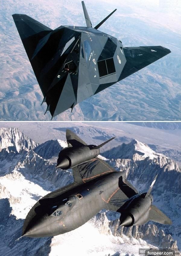 下圖是臭鼬小組研發,被小組暱稱為 The Hopeless Diamond 的 F-117“夜鷹”隱形戰機 Nighthawk (上) 及 SR-71“黑鳥”隱形偵察機 Blackbird (下)。