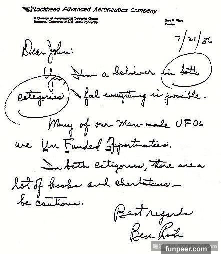 類似以上的間接證據還有,洛克希德‧馬丁 (Lockheed Martin) 武器公司最秘密的研發臭鼬小組 Skunk Works 的前主管班瑞奇 Ben Rich,直到 1995 年去世前,曾經多次在演講或信件中透露出不少蛛絲馬跡。