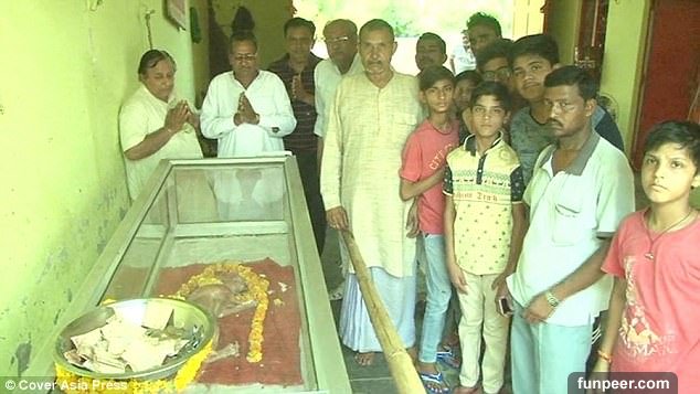 不過當地的村民依舊把牛屍放展示箱中,讓趕著前來朝聖的民眾都有機會可以對祂膜拜,因為他們都相信,這隻小牛是印度教神祇「毗濕奴」的化身...