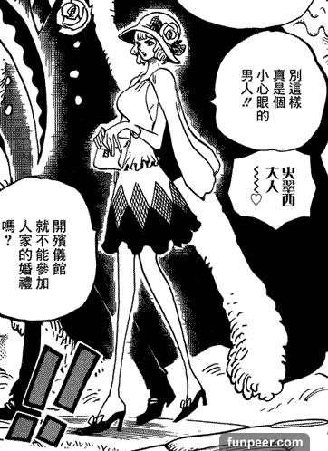 歡樂街,也就相當於我們的紅燈區,而這個歡樂街女王說好聽點是女王,其實就是老鴇啦。怪不得要替派克洛說話,原來自己的職業也是不那麼受人待見。職業雖不光彩,但尾田老師在刻畫史翠西時真下了不少功夫,看特寫便知。